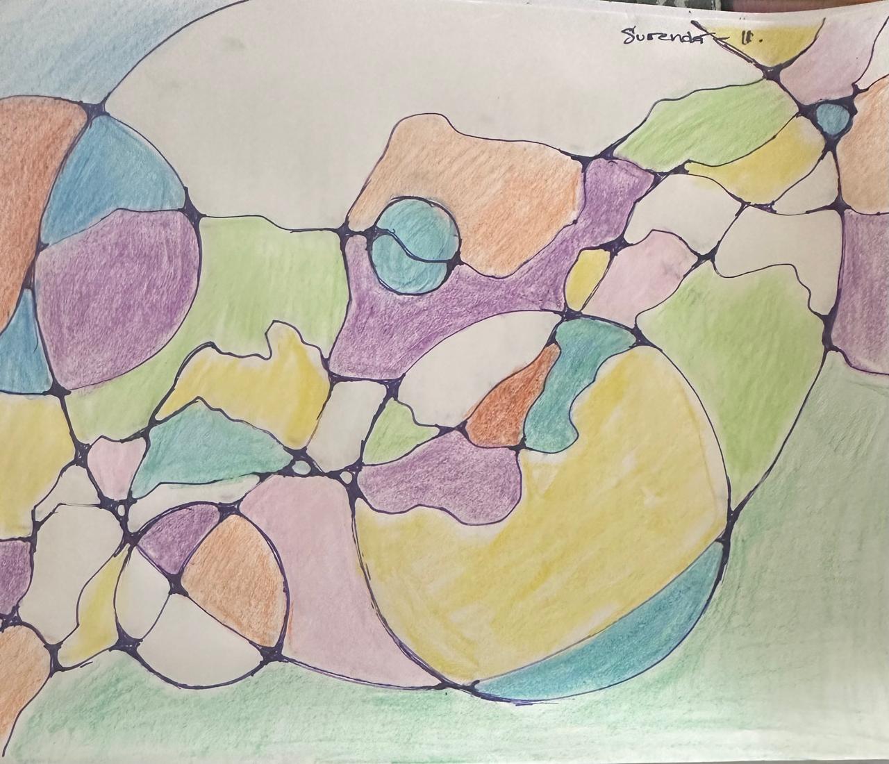 Drawing the free-flowing, curved lines and rounding the sharp intersections physically mirrors a process of soothing neural pathways. This action sends a powerful signal of safety to the brain, which helps to resolve internal conflict and immediately dials down the Sympathetic Nervous System (stress response). The focused application of colour further promotes a state of “flow,” activating pleasure centers and contributing to emotional regulation (Neuroaesthetics).